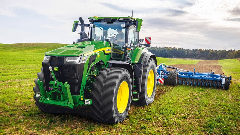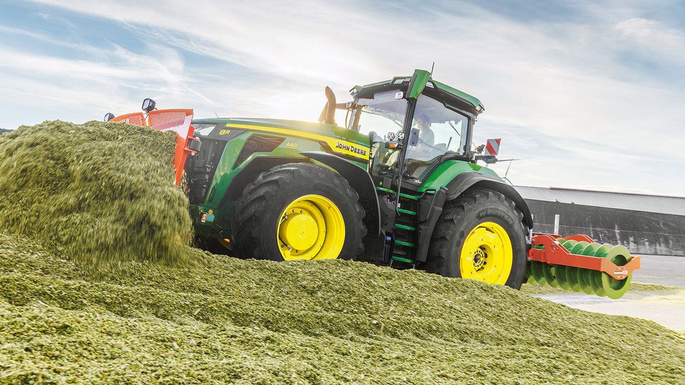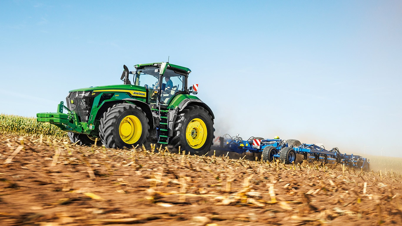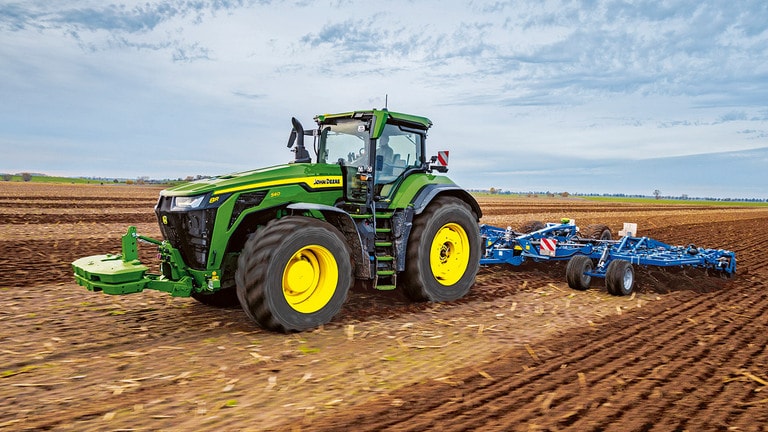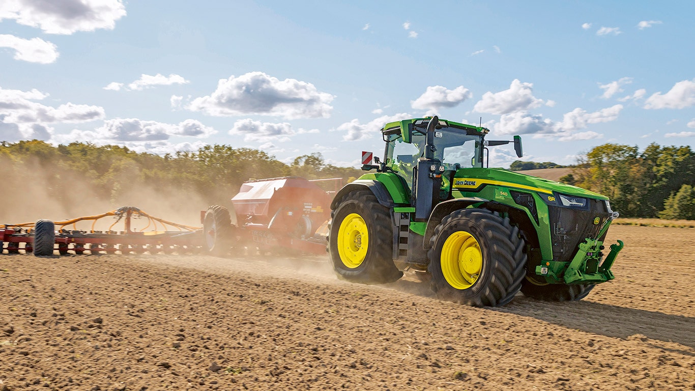 Die neuen 8R High Horsepower Traktoren liefern die Zugkraft, die Sie für die anspruchsvollsten Anbaugeräte benötigen. Mit IPM-Spitzenleistung stellt der JD14-Motor genau dann bis zu 634 PS bereit, wenn sie benötigt werden – für höchste Produktivität unter allen Einsatzbedingungen. Das einzigartige eAutoPowr™ ermöglicht eine stufenlose Beschleunigung und eine um bis zu 8 % bessere Kraftübertragung im Vergleich zu herkömmlichen hydro-mechanischen stufenlosen Getrieben*. Die neuen 8R High Horsepower Traktoren verfügen über bis zu 2,30 m Hinterreifen, bis zu 1,85 m Vorderreifen und eine Einzelleitung-Reifendruckregelanlage für optimalen Bodenschutz, effiziente Kraftübertragung und maximale Vielseitigkeit.